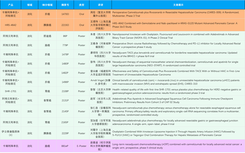 在消化系统肿瘤领域,凯时官网产品相关研究共入选2项口头报告、11项壁报和1项电子壁报,共14项研究。除卡瑞利珠单抗和阿帕替尼外,还有4篇阿得贝利单抗治疗消化系统肿瘤研究入选。HRS-4642、瑞拉芙普-α注射液(SHR-1701)等在研创新产品也有相应研究亮相。另有1项伊立替康脂质体(II)用于胰腺癌治疗的研究入选壁报。
